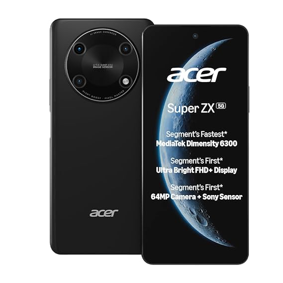Acer Super ZX 5G (Carbon Black, 6GB RAM, 128GB Storage) | 120 Hz FHD+ Display | 5000 mAh Ultra-Thin Battery | Dimensity 6300 5G Processor | Sony 64MP AI Camera